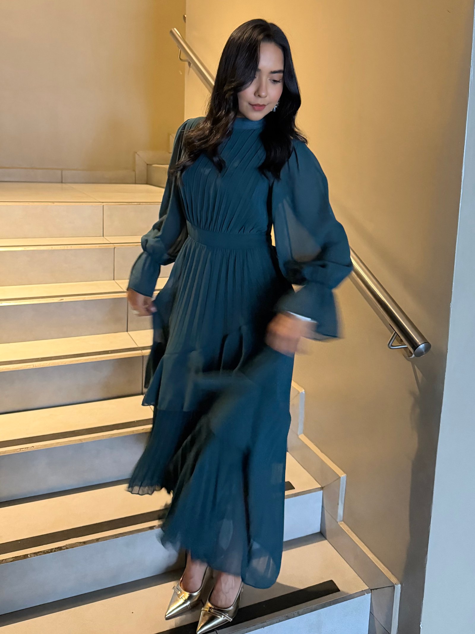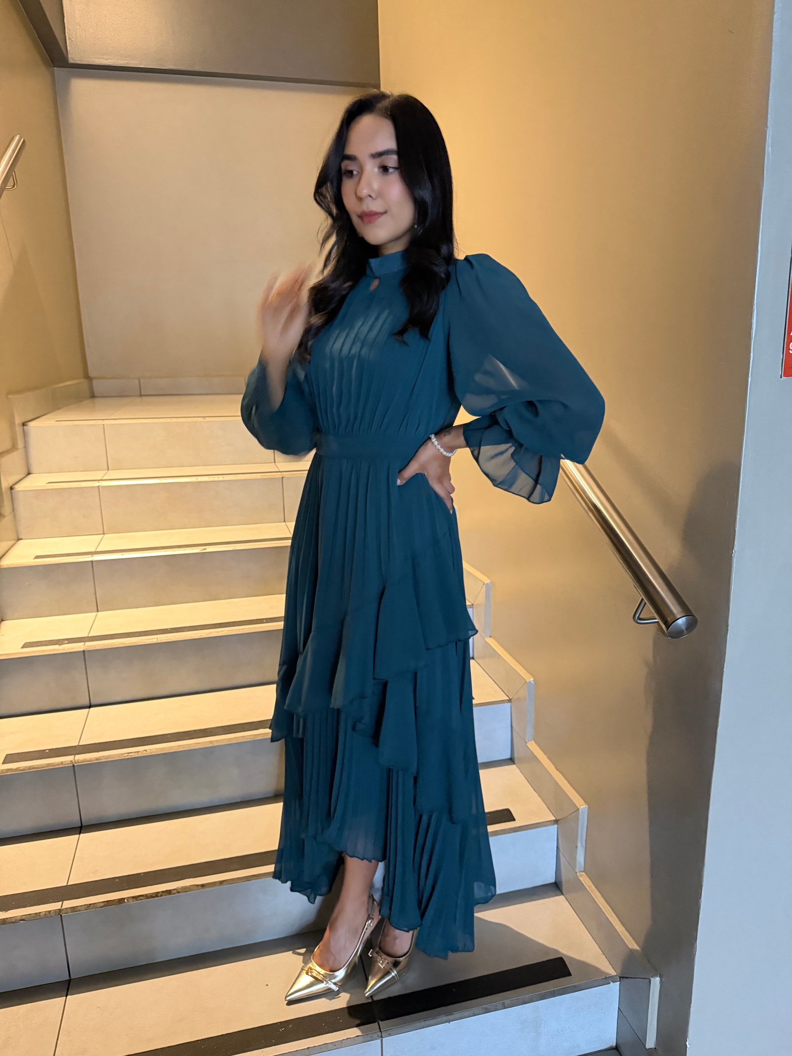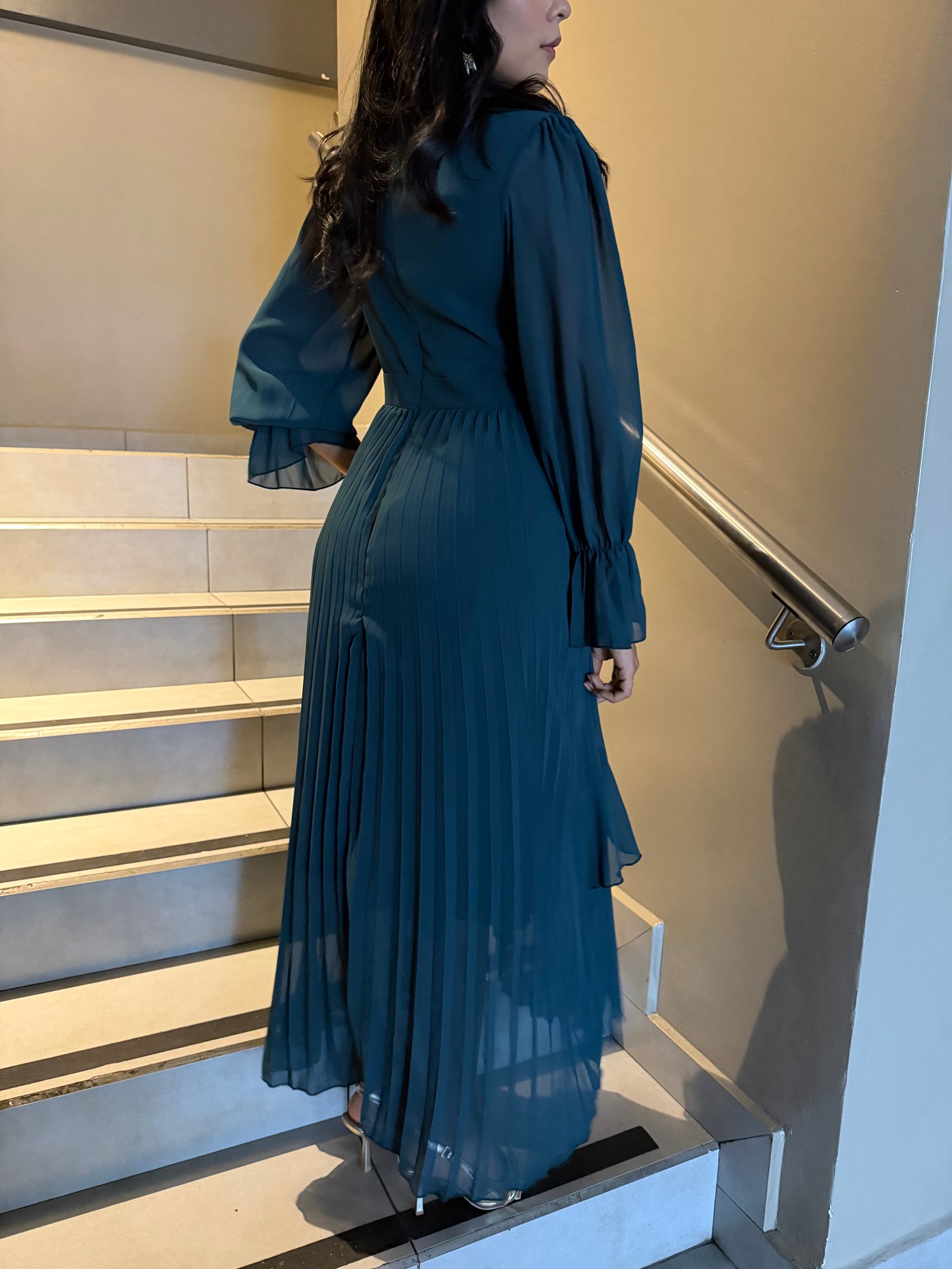 VESTIDO MAXI AQUA MANGA LARGA CON FLECOS
