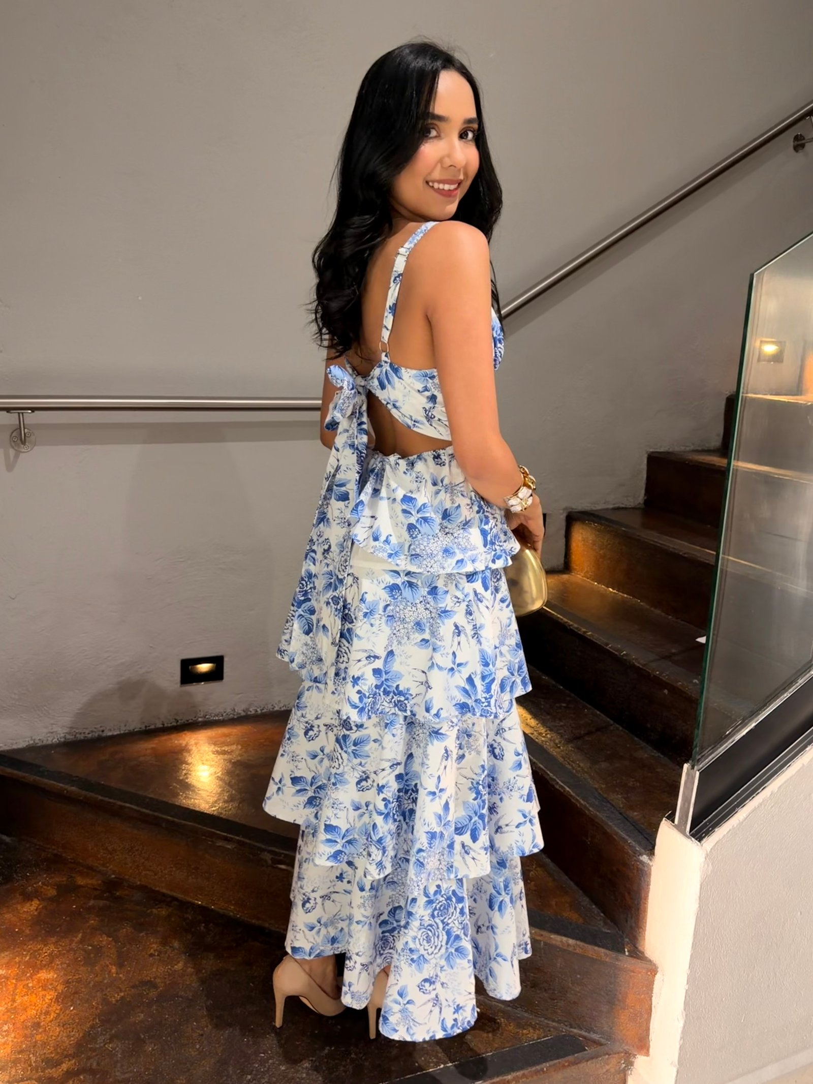 VESTIDO MAXI FLECOS FLOREADO AZUL